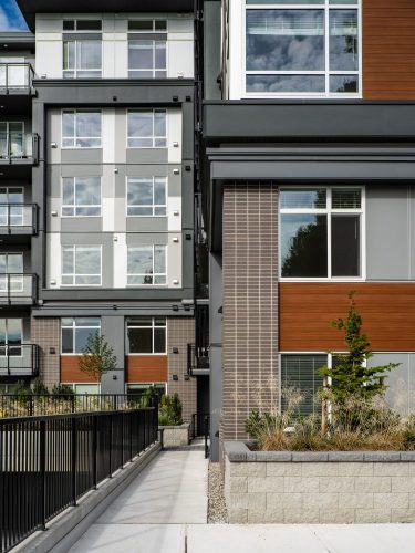 - Exterior composition balances grey, white, and steel tones with inviting wood-textured accents and masonry elements that ground the buildings and add material richness