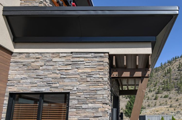 - Selected a durable mix of EIFs with v-groove reveals and a sandblast finish, textured cultured ledgestone, and warm aluminum woodgrain siding to create a façade that feels both grounded and refined