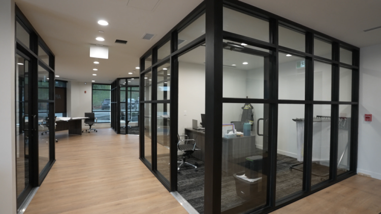 - Natural light fills the space through black-framed glazing, connecting private offices and shared zones to foster openness and collaboration