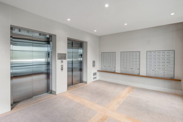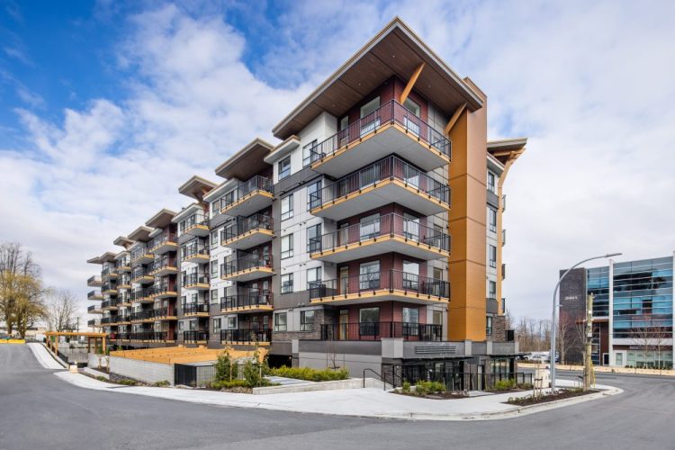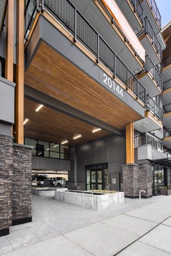 - Main entrance features a stylish passthrough design, with a roof adorned in wooden cladding and accent lighting. The same aesthetic extends to the roof overhangs, safeguarding the wraparound corner balconies.